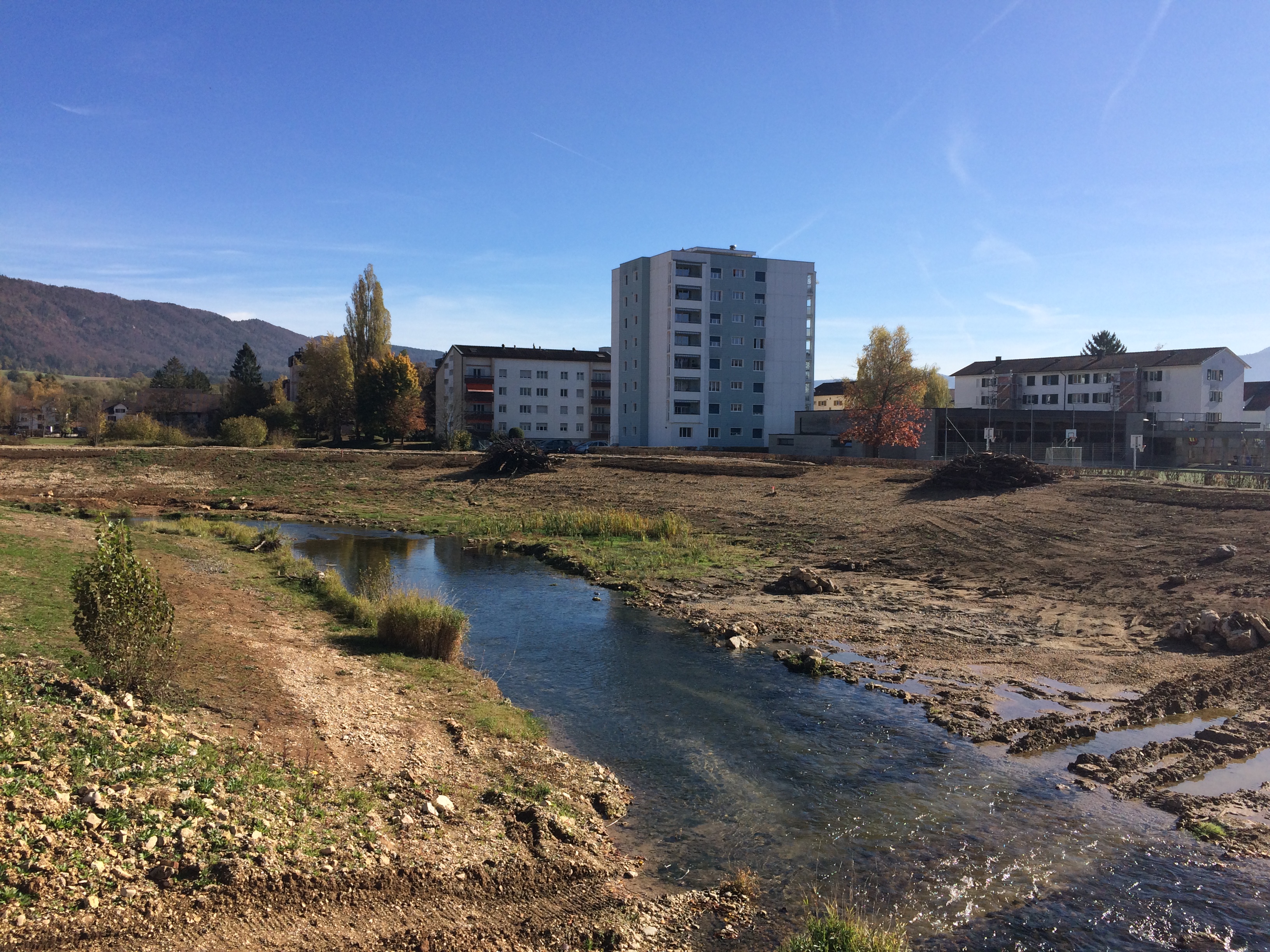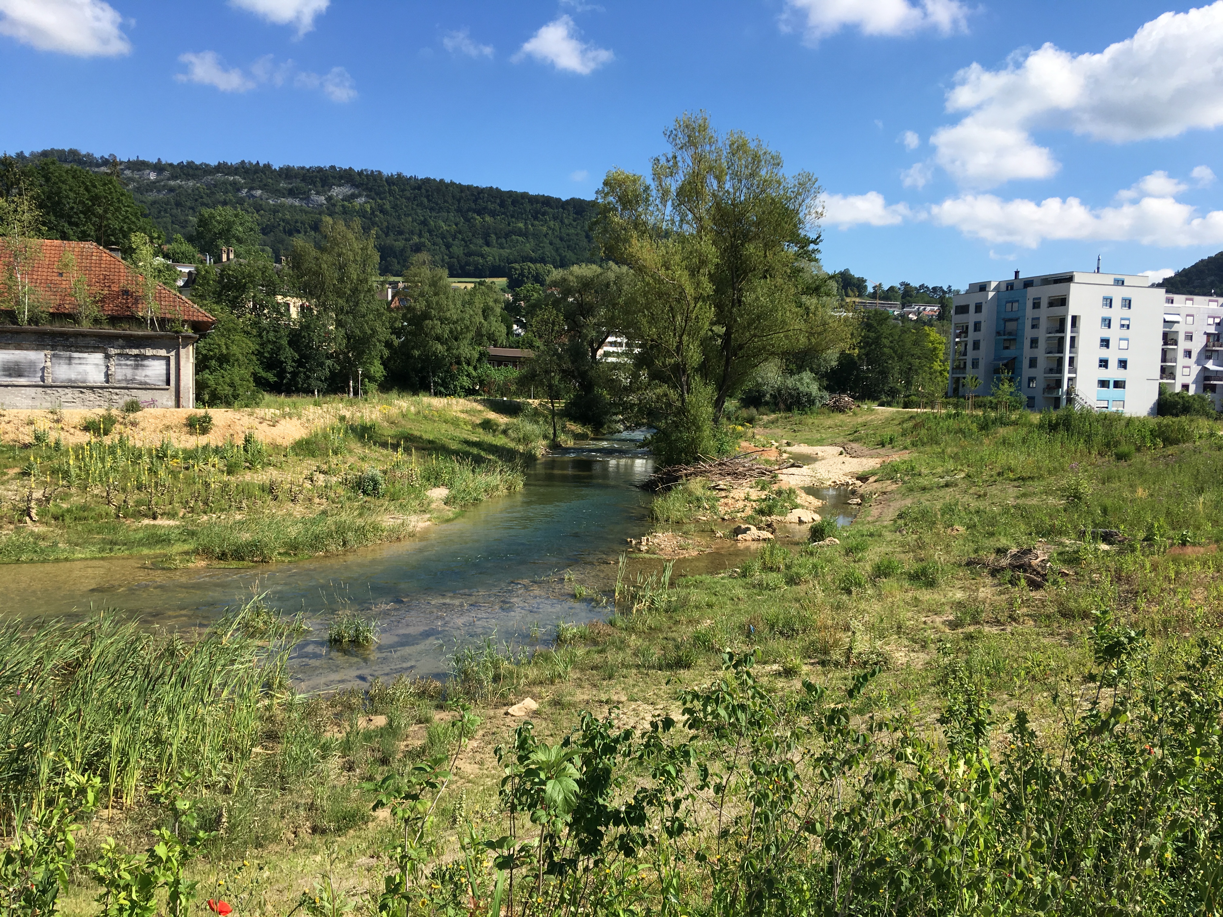 Les surfaces aménagées de manière proche de la nature ont été semées avec des mélanges diversifiés et plantées d’arbustes adaptés. Le long du cours d’eau, des chemins, des bancs et des accès à l’eau invitent à la détente et rendent le paysage fluvial accessible au quotidien.