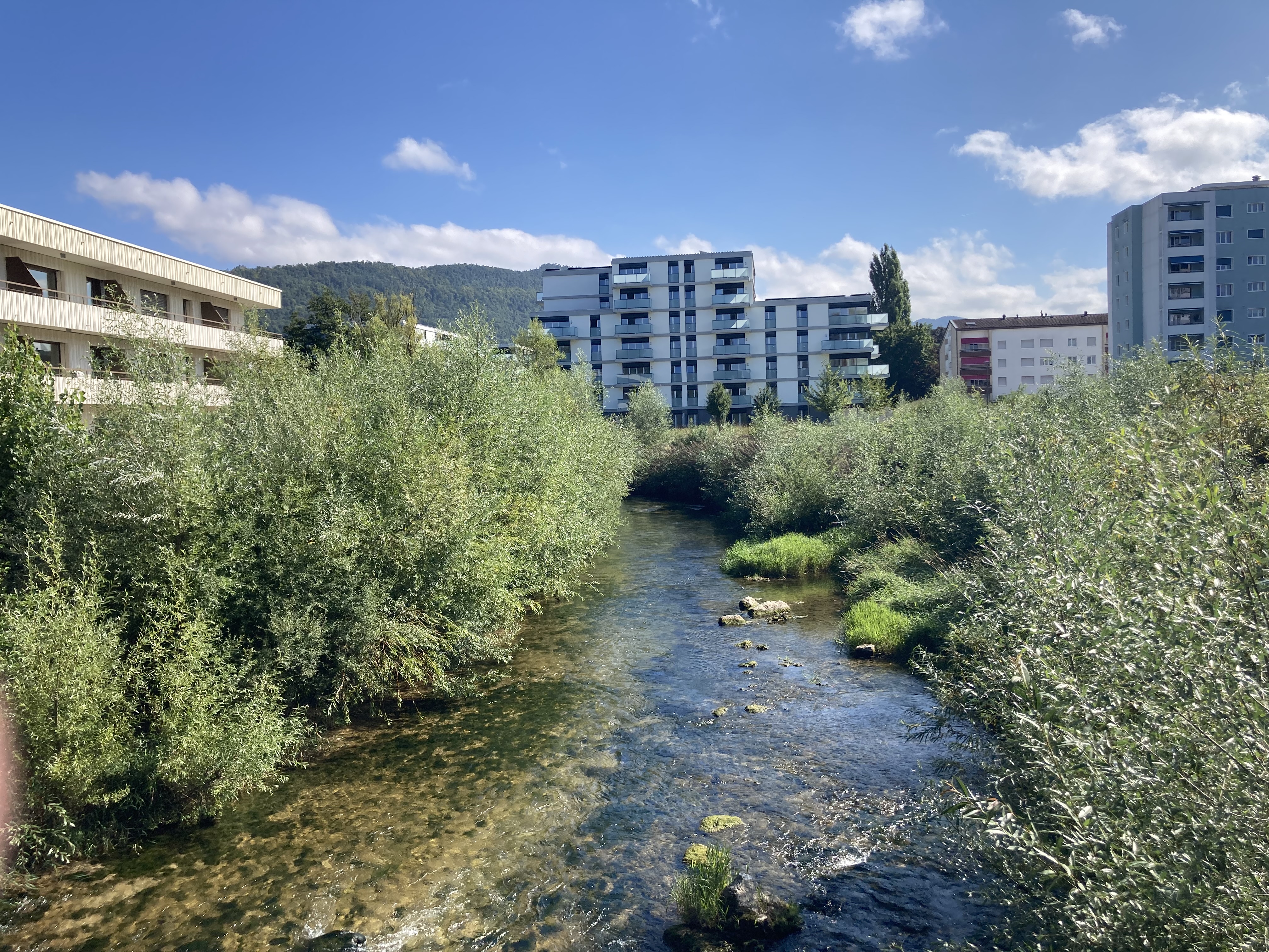 - Le projet se distingue notamment par la mise à disposition généreuse d’un espace fluvial, malgré la proximité de constructions existantes ou prévues. Grâce à cela, la Sorne a pu être aménagée de manière naturelle en contexte urbain, en bénéficiant de suffisamment de place pour son évolution naturelle et pour la rétention des crues.