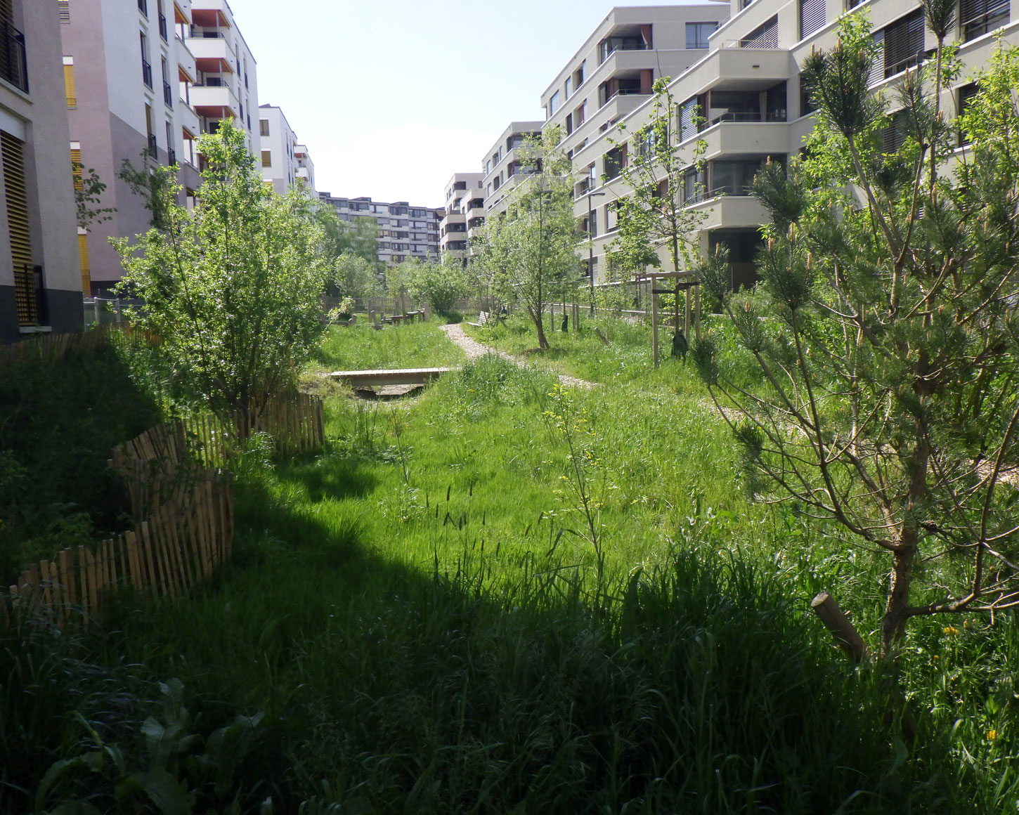 L’écoquartier est l’occasion de tester de nouvelles techniques constructives. Ainsi, une solution technique découlant d’un projet de recherche mené conjointement par le Service des parcs et domaines (SPADOM) et le Service de l’eau permettra de construire des fosses de plantation fonctionnant comme bassin de rétention. Cette technique vise à conserver l’eau sur le site comme une ressource et non comme un déchet afin d’accroître les bénéfices écosystémiques des végétaux et de lutter plus efficacement contre les îlots de chaleur urbains.