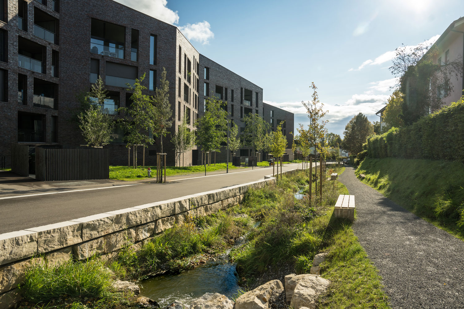 La section revitalisée du Früeblibach a été conçue de manière à retenir l’eau, à se développer de manière autonome et à s’intégrer dans l’espace adjacent. Sur une longueur d’environ 80 mètres, le ruisseau a été élargi, partiellement mis à ciel ouvert et aménagé avec des éléments structurels variés. Une caractéristique importante du projet est l’interaction coordonnée entre l’espace aquatique et l’espace routier. L’aménagement de l’espace routier tient compte du drainage naturel et du stockage temporaire des eaux pluviales via des surfaces végétalisées et des éléments structurels. La conception de l’espace routier tient compte du drainage naturel et du stockage temporaire des eaux pluviales via des surfaces végétalisées et des éléments architecturaux. Cela favorise l’évaporation, la rétention et le refroidissement sans que des solutions techniques ne soient mises en avant.