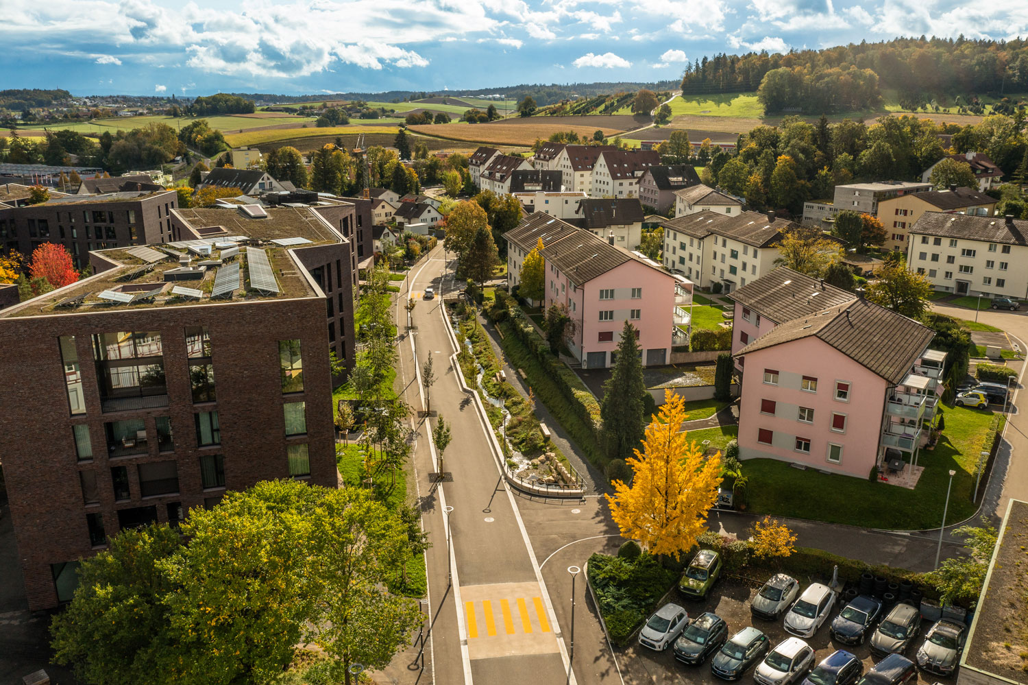 Les arbres le long de la Geerenstrasse remplissent plusieurs fonctions. Outre leur importance pour l’ombrage et la qualité de vie, ils contribuent à l’aménagement de l’espace routier adapté au climat et favorisent le régime hydrologique local. La végétation et les surfaces ont été coordonnées de manière à ce que l’eau de pluie soit acheminée et retardée le plus près possible de la surface.